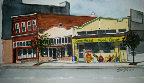 Saturday morning was nice, so I loaded the dogs, took them to the beach, grabbed a coffee, then headed out for some sketching time. Decided to try some downtown sketching and picked the Coos Head Food Co-op and nearby buildings in North Bend, Ore. Granted, the perspective is a little off and so are the lines — but hey, it’s a sketch. Just something for fun and to keep me in practice.