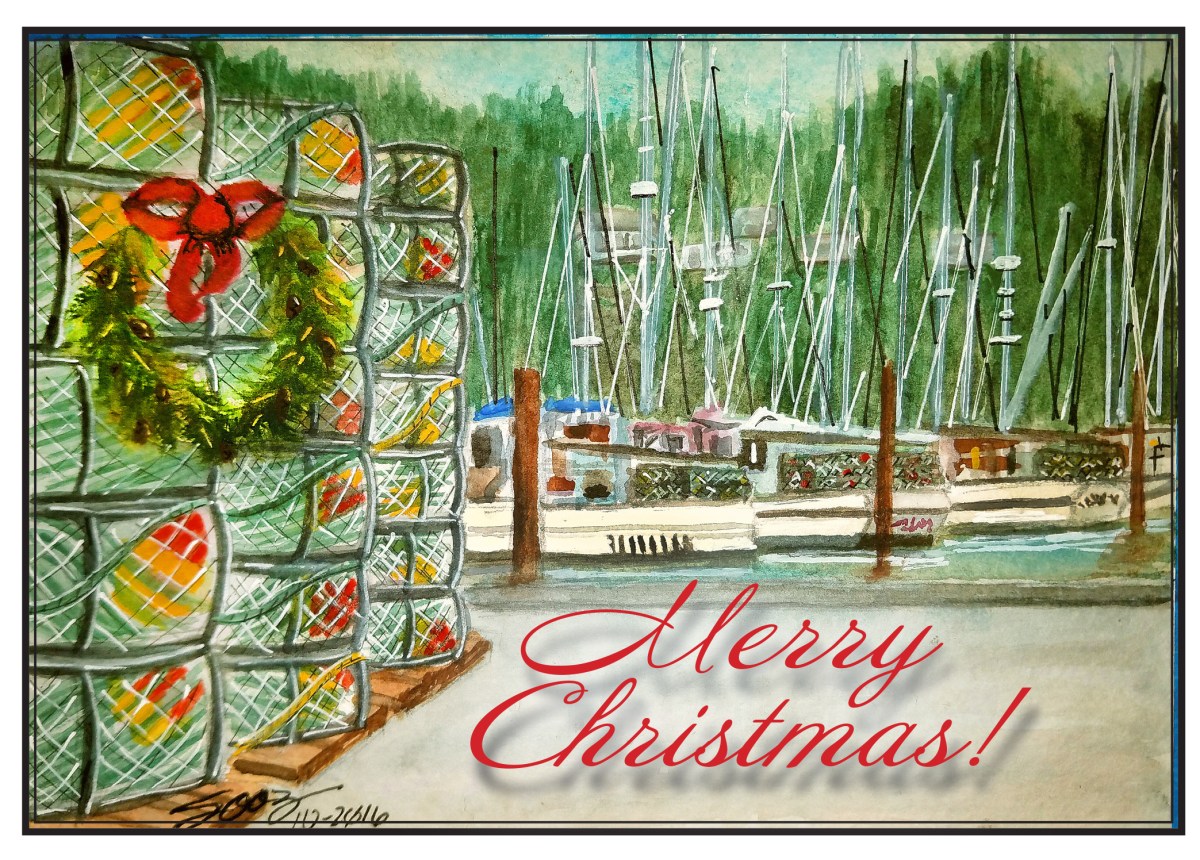 To that end, if you are looking for fishy Christmas cards, your needs can be met at both Art of Life gallery in Coos Bay and Bayside Coffee in Charleston. I have a couple new featured Christmas cards this year, including one of crab pots at the harbor (above) and a Dungeness crab in eel grass. I also re-created the “shellfish clam” from last year. For those of you with friends and relatives in New England, we have a Christmas lobster shack you can share with those back East. Check out the slideshow below for all three.