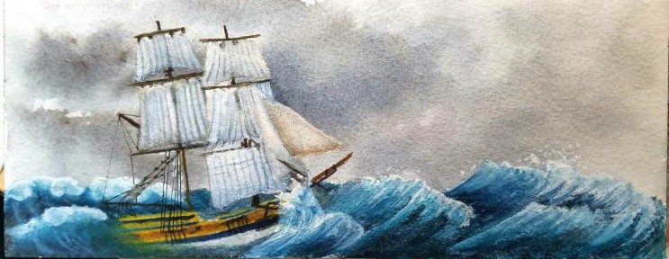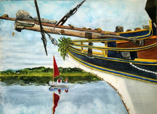 The weather was perfect for an evening stroll down to the Coos Bay docks when the Lady Washington and Hawaiian Chieftain were in port. The bay was smooth as glass and just beautiful. I grabbed a shot of the bow of the Lady Washington with two people on a small sailboat on the bay and painted the scene later in the year.