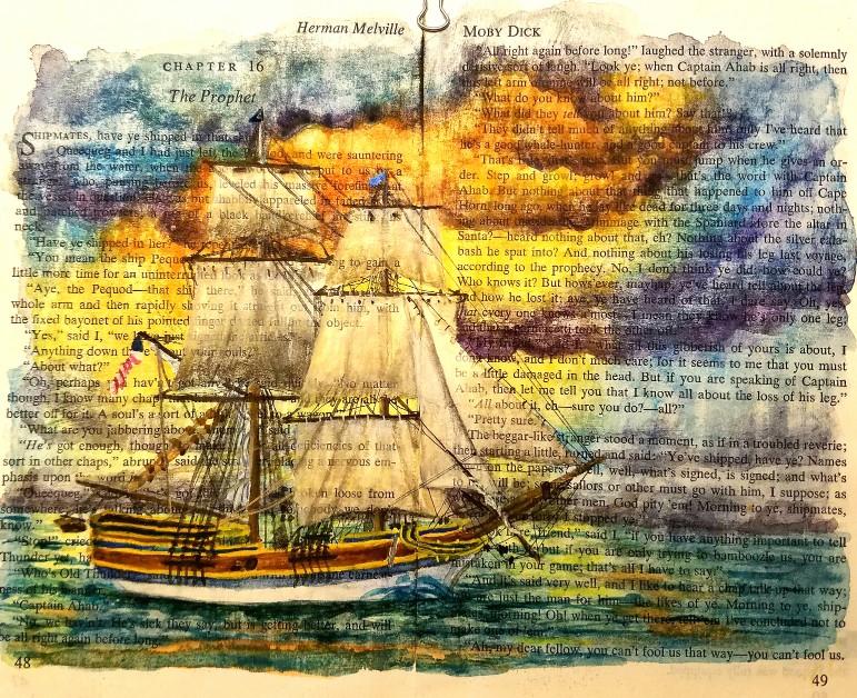 I used the same picture and my imagination to create “A Whimsical Voyage,” on pages from a condensed version of Moby Dick.